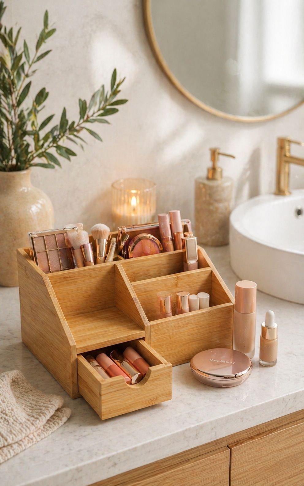 Fabricada en bambú natural, aporta calidez al ambiente y se adapta perfectamente a escritorios, tocadores o cualquier rincón que necesite organización con un toque deco.