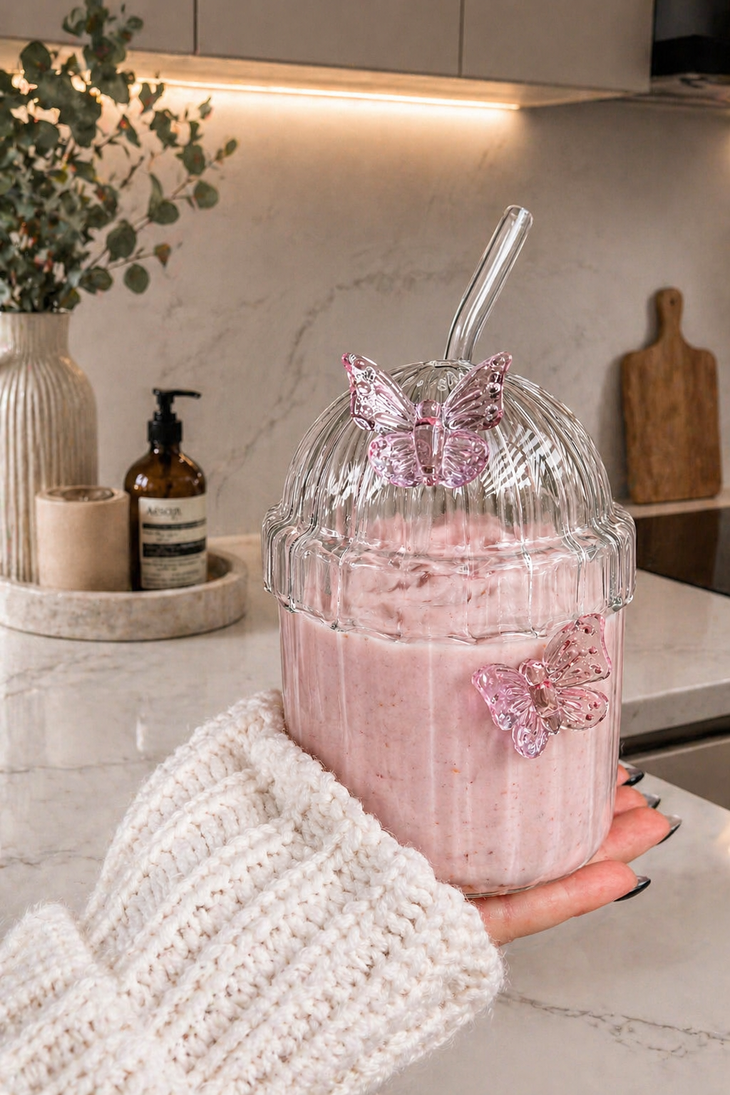 Dale un toque delicado y encantador a tus momentos favoritos con el vaso Butterfly Cute. Su diseño transparente con detalles de mariposas decorativas combina elegancia, estilo aesthetic y un acabado único que realza cualquier mesa o bebida.